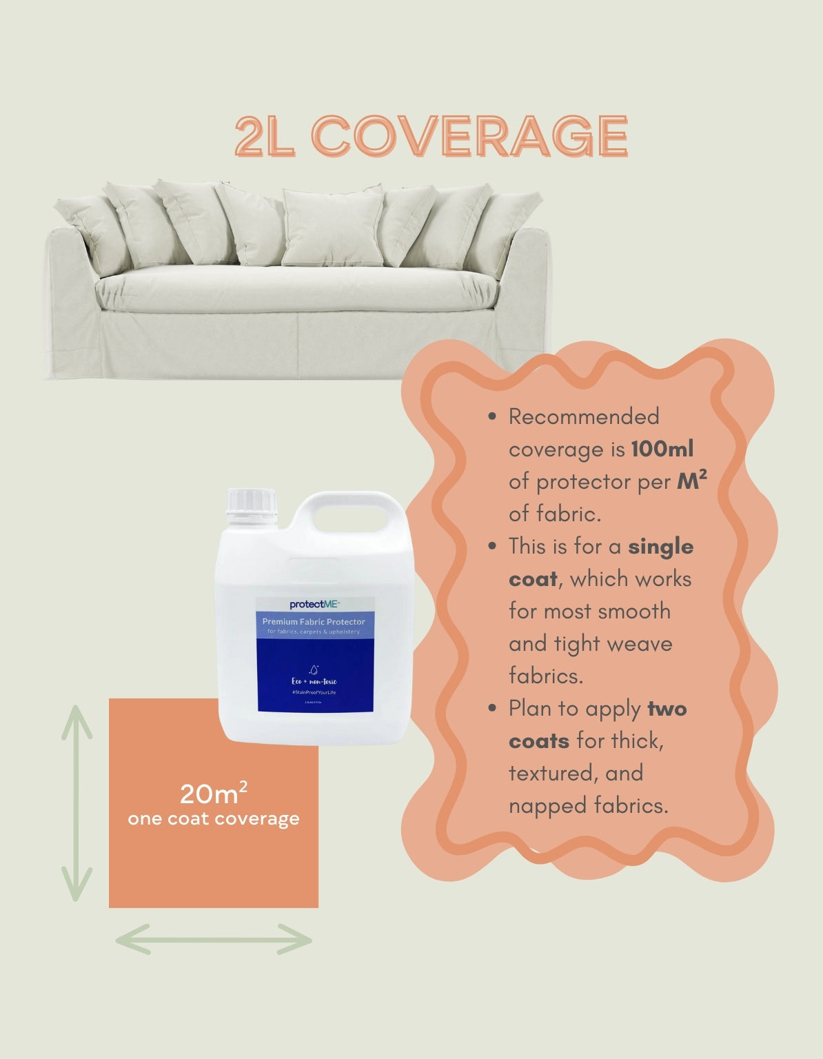 Our 2L bottle will protect up to 20m2 of fabric, or 10m2 if you need two coats of product — often for thicker or textured fabrics.